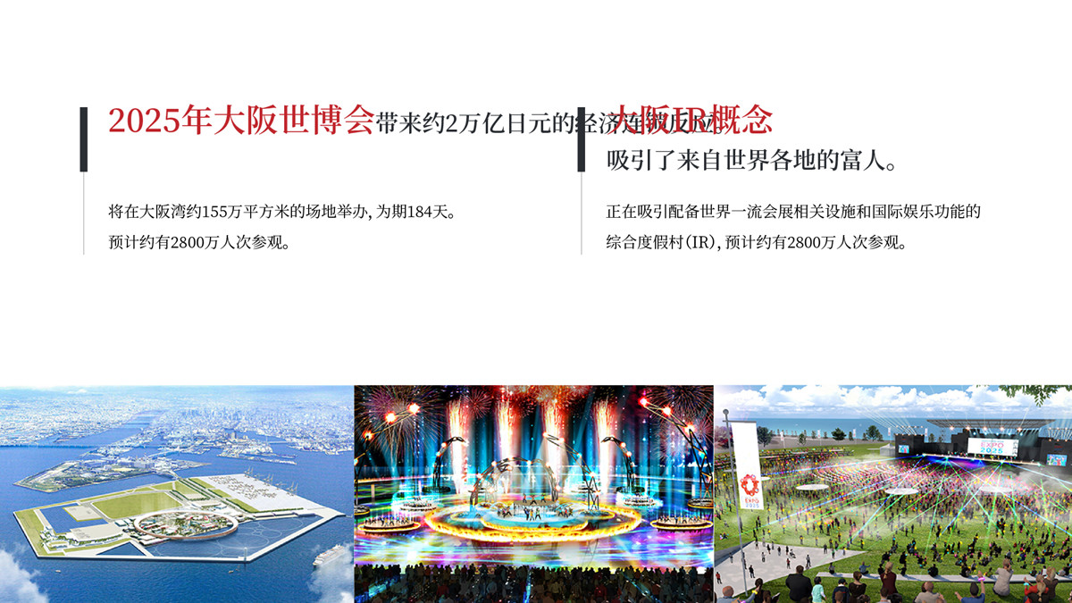 2025年大阪世博会带来约2万亿日元的经济连锁反应。约155万平方米的场地举办,为期184天。预计约有2800万人次参观。 位于日本桥商圈,「日本橋」站550米步行7分钟,「谷町九丁目」站700米步行9分钟,时尚和文化潮流的中心。