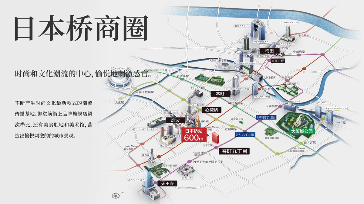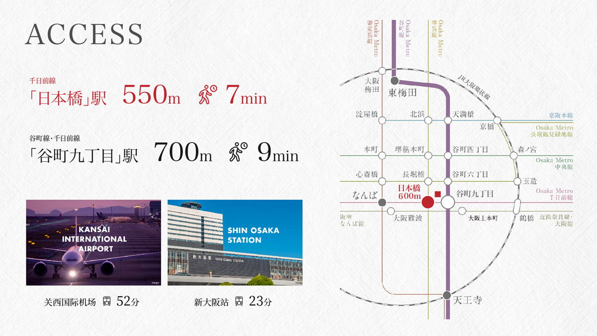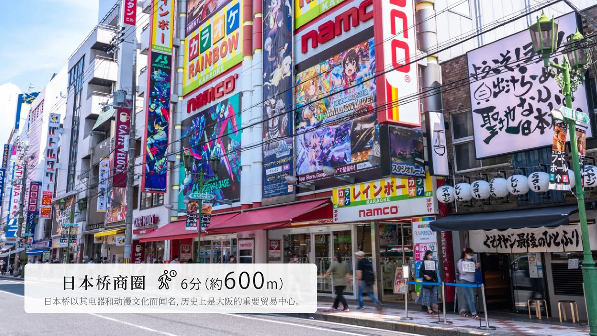 2025年大阪世博会带来约2万亿日元的经济连锁反应。约155万平方米的场地举办,为期184天。预计约有2800万人次参观。 位于日本桥商圈,「日本橋」站550米步行7分钟,「谷町九丁目」站700米步行9分钟,时尚和文化潮流的中心。